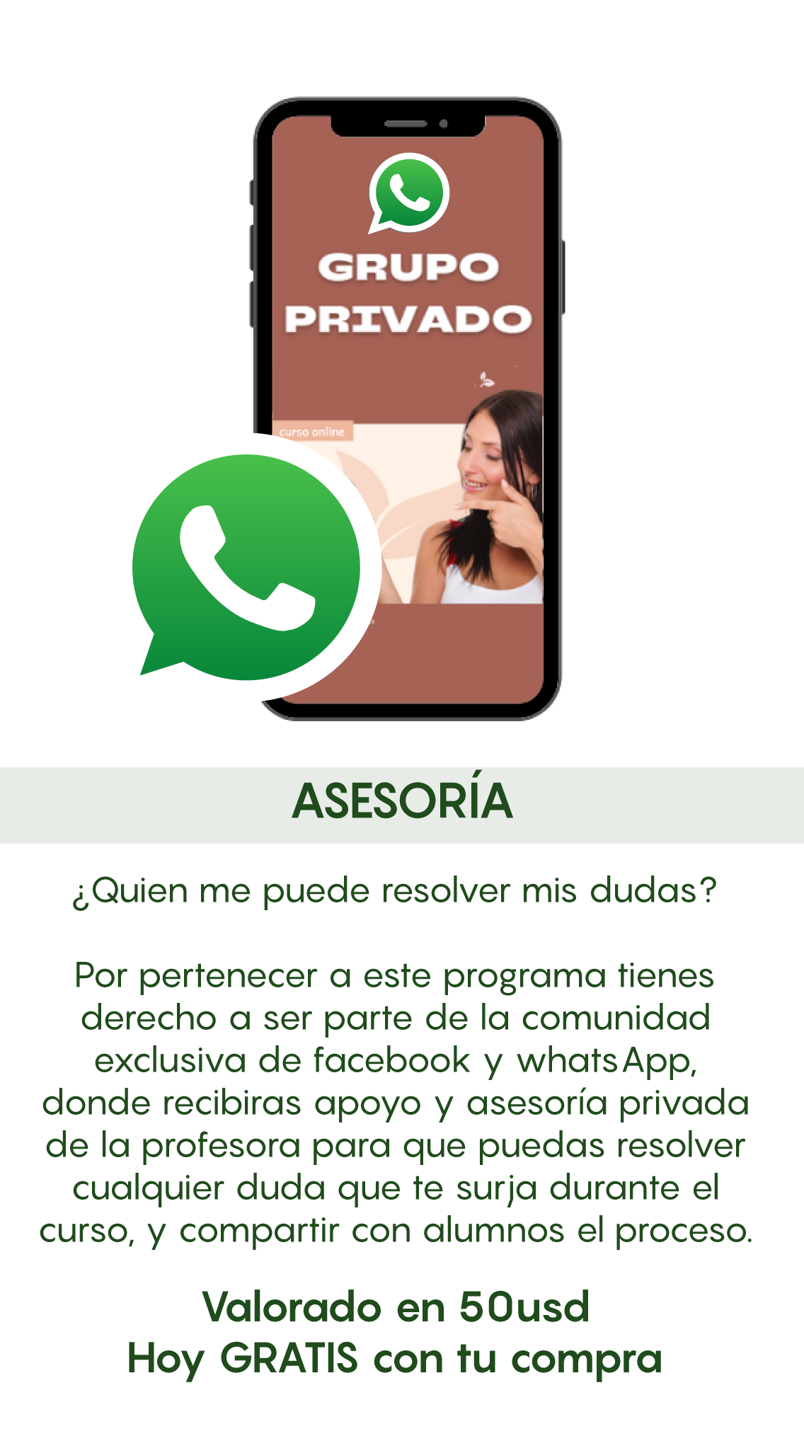 🌿Tendrás acceso un canal exclusivo de facebook y whatsapp de alumnos donde se resuelven dudas y se comparten las creaciones y evoluciones de cada uno.