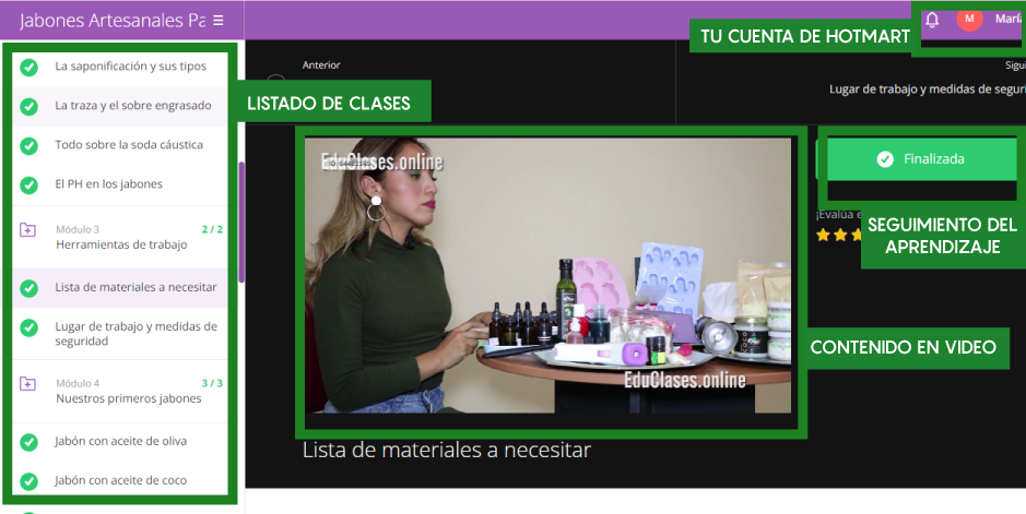Nuestro curso se encuentra dividido por módulos en formato de VIDEO por lo que podrás acceder siempre para revisar todas las clases, podrás avanzar, pausar y retomarlo las veces que desees. Además, tendrás todas las recetas en formato PDF para que sea más sencillo y no tengas que estar copiando las fórmulas del video